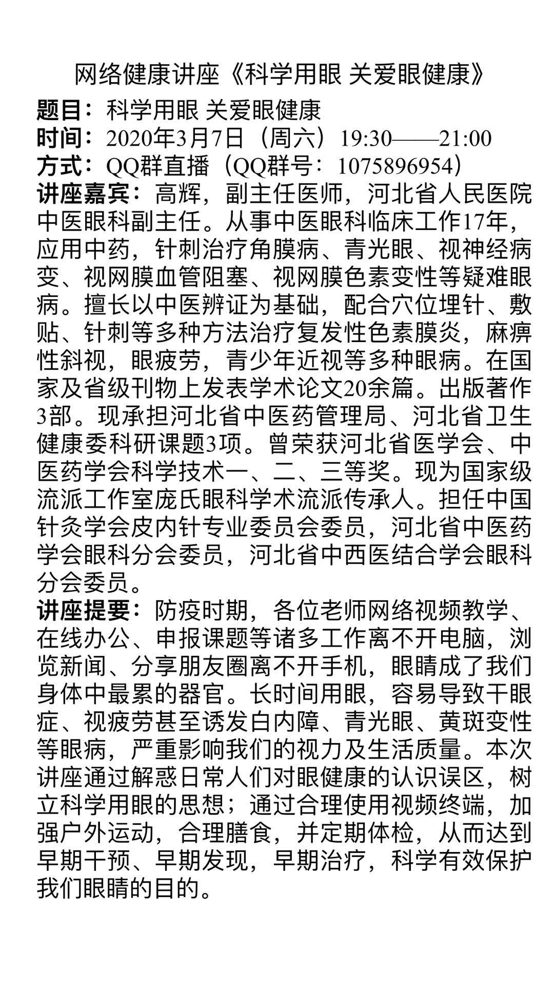 分工会紧扣“健康防疫”主题开展系列线上活动,一是《科学用眼 关爱眼健康》QQ群课堂讲座,与经济管电子百家乐