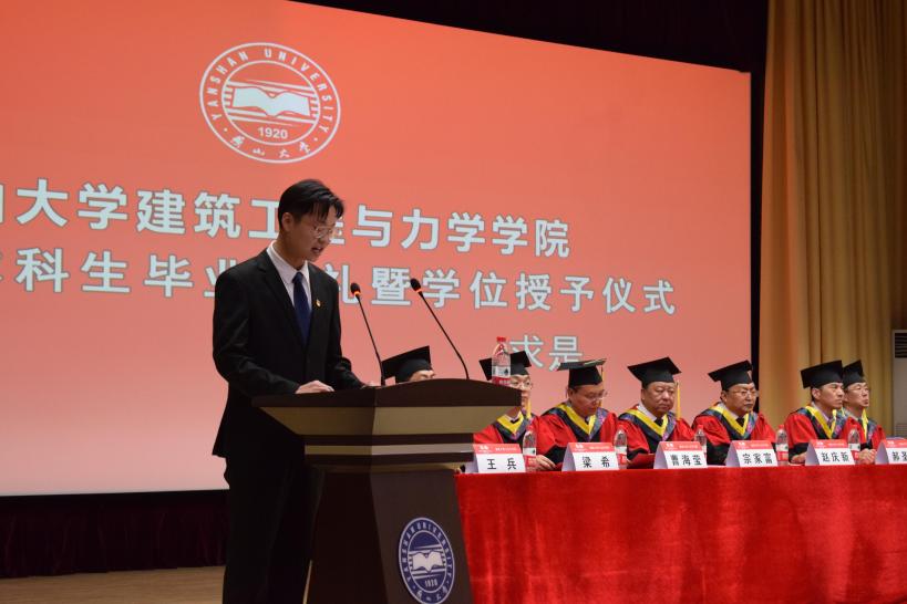 向各位毕业生表示热烈的祝贺,向为学生的成长倾注心血、默默耕耘的老师们致以最诚挚的感谢。赵庆新院长对毕业生提出六点希望:一是树立明确的奋斗目标。要带走燕大人为理想而奋斗的精神。二是脚踏实地干实事。把眼前每一份小的工作当成一份事业来完成。三是勇于创新。通过学习、思索和领悟提高学习效率。四是锻炼身体强健体魄。多为自己的身体充电。五是助人为乐。急人之困,助人终助己。六是多一点情怀。踏踏实实做好每一个工程就是建工人的大情怀。赵庆新院长表示,建工网上百家乐