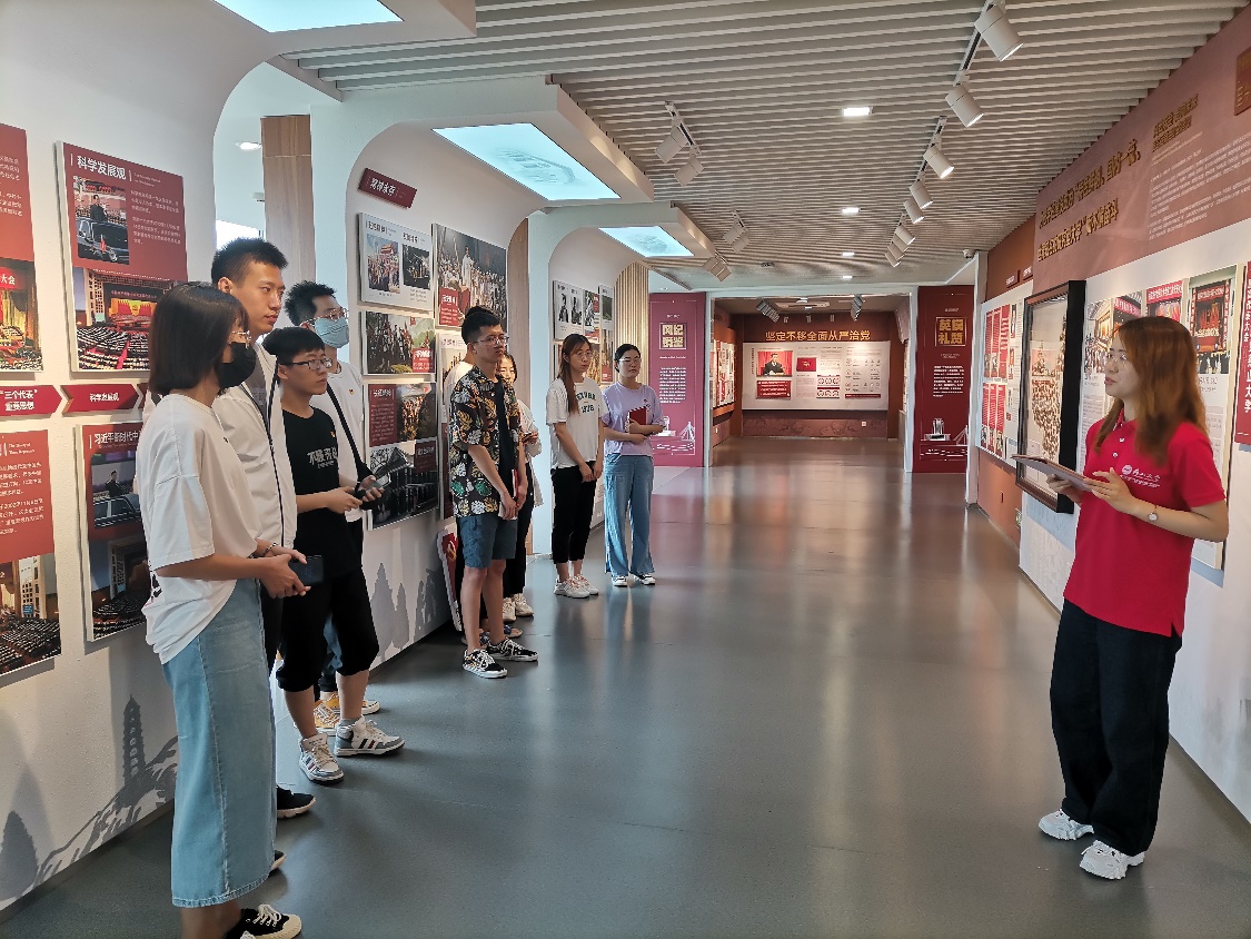 入馆之前,同志们在宣誓厅面向鲜红的党章,举起右手,重温入党誓词。随后,在党员组织生活馆(党员廉政教育基地)工作人员的带领和解说下,党员们先后参观了“红色历程”、“精神谱画”、“风纪镜鉴”、“英模礼赞”四个展厅。党员们通过丰富的照片资料、视频文献、党章地图等重温了中国共产党百年奋斗的光辉岁月和伟大丰厚的精神谱系,进一步了解了中国共产党严明刚性的纪律规矩和无数无私忘我的英烈模范事迹等。其中,由原校党委副书记陈春利捐赠的154枚红色徽章地图吸引了大家的注意,一枚枚徽章,充分向大家展示了中国从站起来、富起来到强起来的历史飞跃中的每一次的惊涛骇浪、不懈探索。