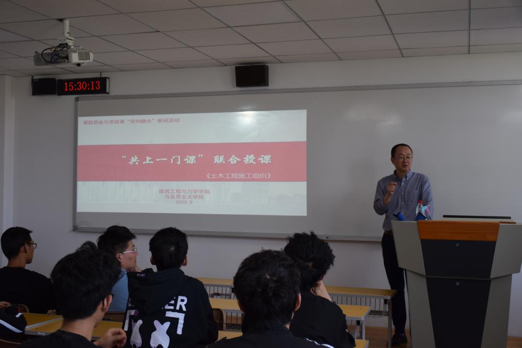 潘鹏程老师从河北省课程思政示范课程“土木工程施工组织”的教学内容中选取了一个教学节段进行现场授课。潘老师以疫情期间“火神山”医院建造中的施工组织为例,运用PPT并辅以相关视频,深入浅出地讲解了工程建造中的施工组织问题,并结合实例完美展现了我们党和国家始终坚持“生命至上、人民至上”的抗疫图谱。潘老师驾轻就熟,娓娓道来,将专业知识与思政元素有机融合,充分实现了知识传授与价值引领的统一,深深吸引了在场的每一位师生。潘鹏程老师授课完毕后,杨新宾老师就潘老师授课案例中蕴含的思政知识点进行了拓展和延伸,使同学们对抗疫精神的认识得到了进一步升华。