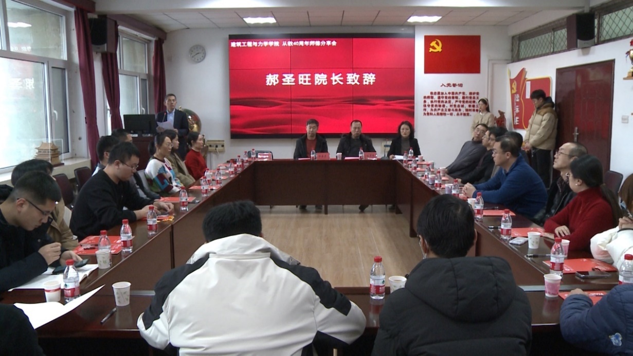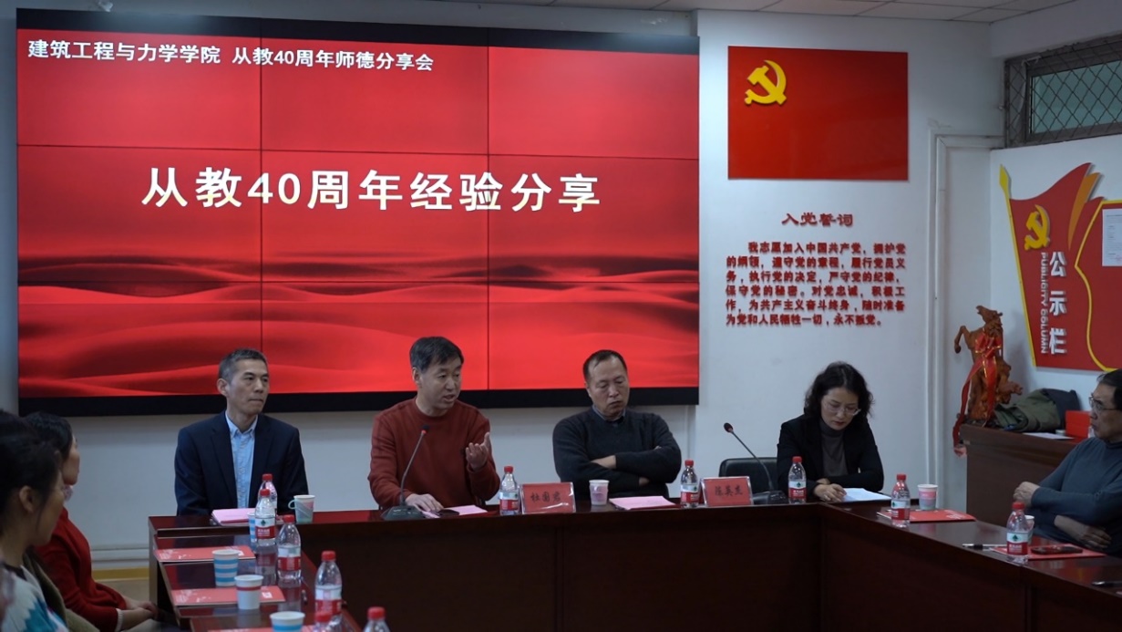 工会举办杜国君和陈英杰教授从教40周年师德分享会——暨青年教师成长沙龙特别节目。郝圣旺院长开场致辞,土木系主任李雨浓、力学系主任梁希、近3年入职的年轻教师以及系部教师代表参会。