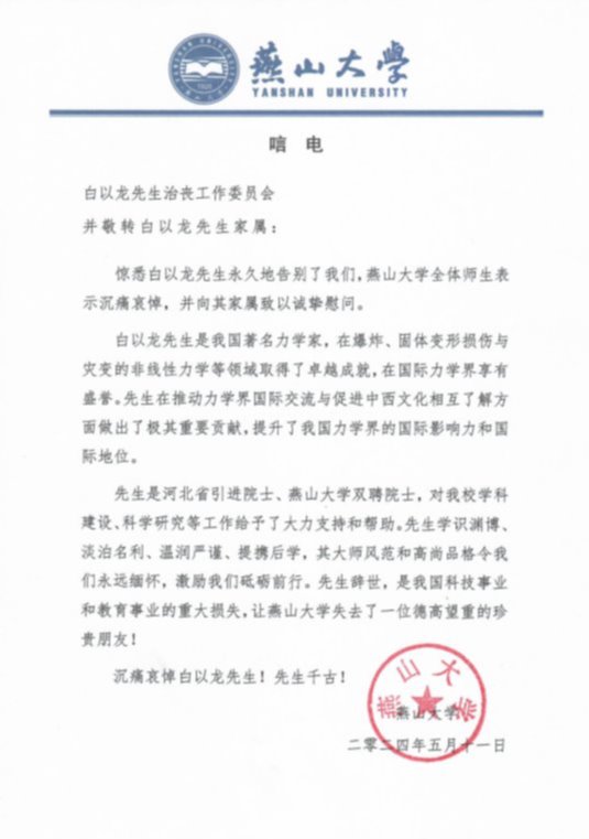 白以龙院士的辞世是力学界的重大损失,燕山大学失去了一位珍贵的好朋友!