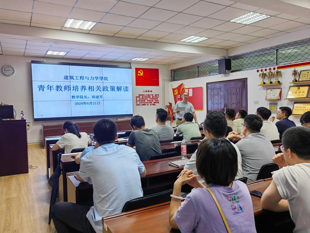 在建筑馆211会议室组织青年教师集中学习教学科研相关政策文件。学习活动由副院长胡建军支持,各系主任、教务管理人员和青年教师参加,涵盖“试卷批阅规范解读”“课程考核材料归档说明”和“青年教师培养相关政策解读”三部分内容。