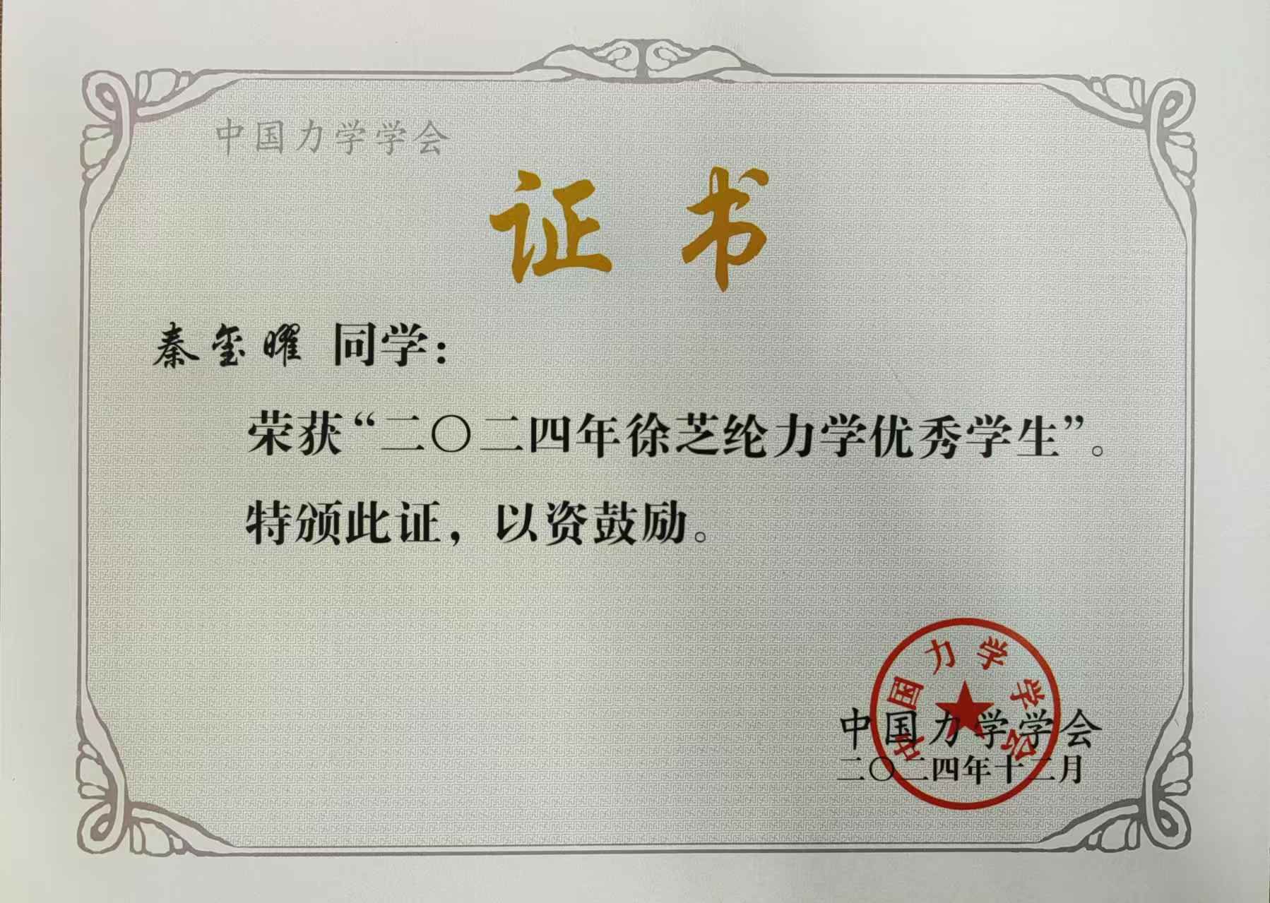 秦玺曜同学荣获“全国徐芝纶力学优秀学生奖”,是网上百家乐
