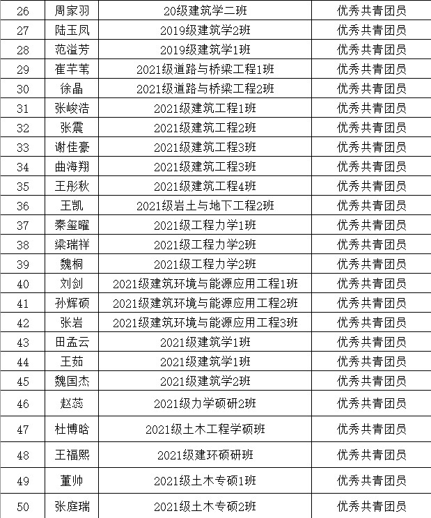 评审工作委员会民主评议等环节,拟推荐张艺等50名学生为燕山大学优秀共青团员、孙嘉蔚等28名同学为燕山大学优秀共青团干部、2020级建筑工程2班等8个团支部为燕山大学五四红旗团支部,名单附后。